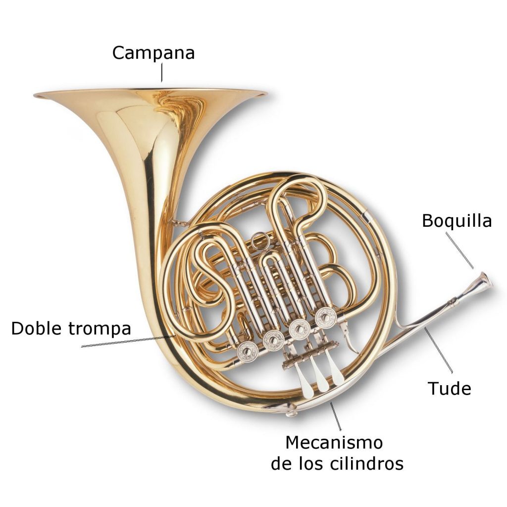La trompa se compone de una larga tubería de metal con forma cónica que se extiende hacia afuera en una campana. En la parte superior de la trompa se encuentra la boquilla, que es donde el músico sopla para producir el sonido.